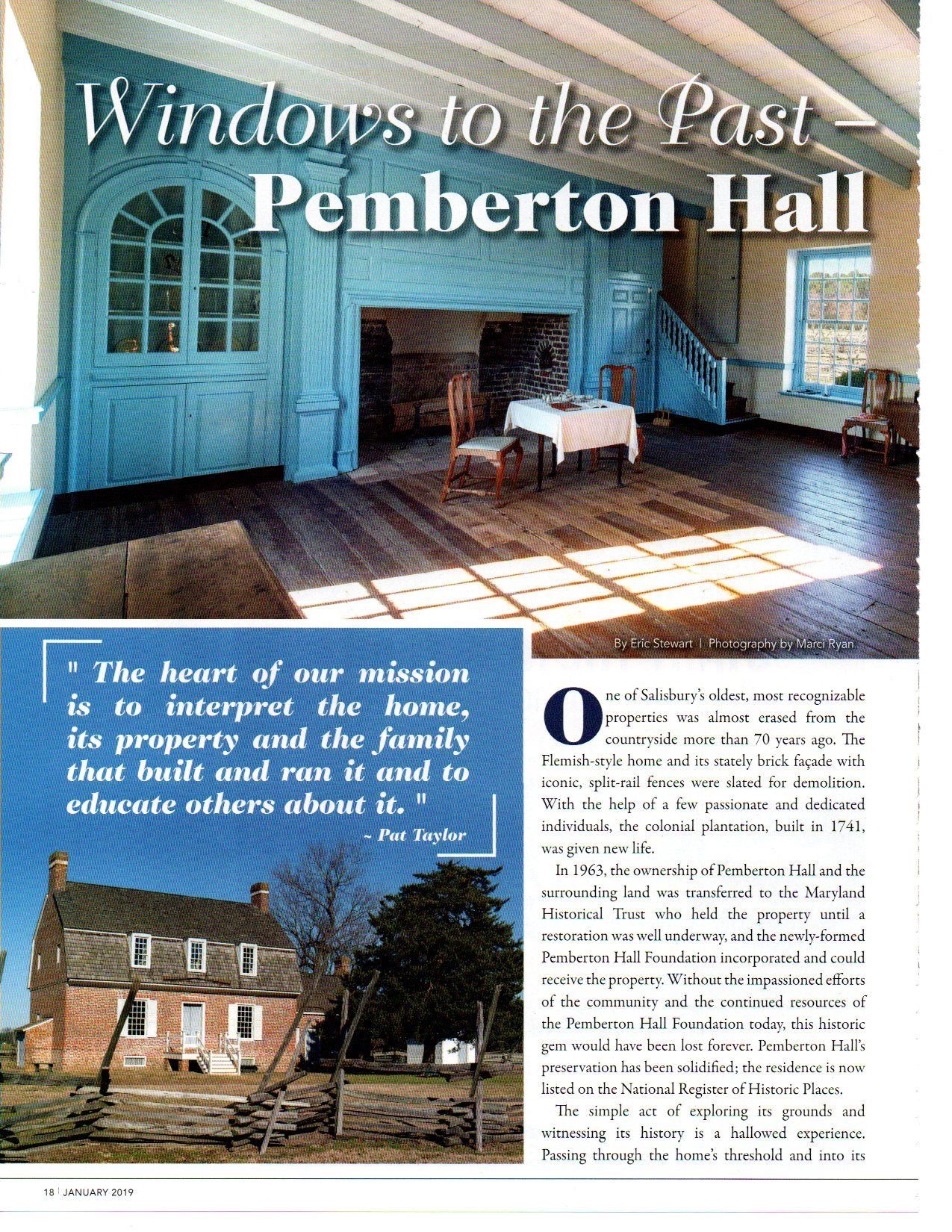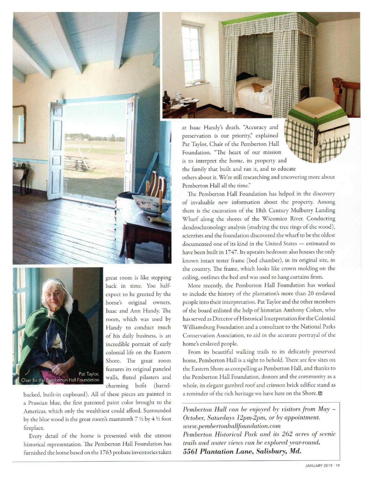 After the plantation house became derelict and threatened with destruction, the Pemberton Hall Foundation, Inc. was formed to restore and interpret this important vestige of our Chesapeake Bay regional heritage. The Hall and two acres are owned and maintained by the Foundation. Pemberton Hall is surrounded by 262-acre Pemberton Historical Park, which maintains three of the original plantation boundaries of 1750.
